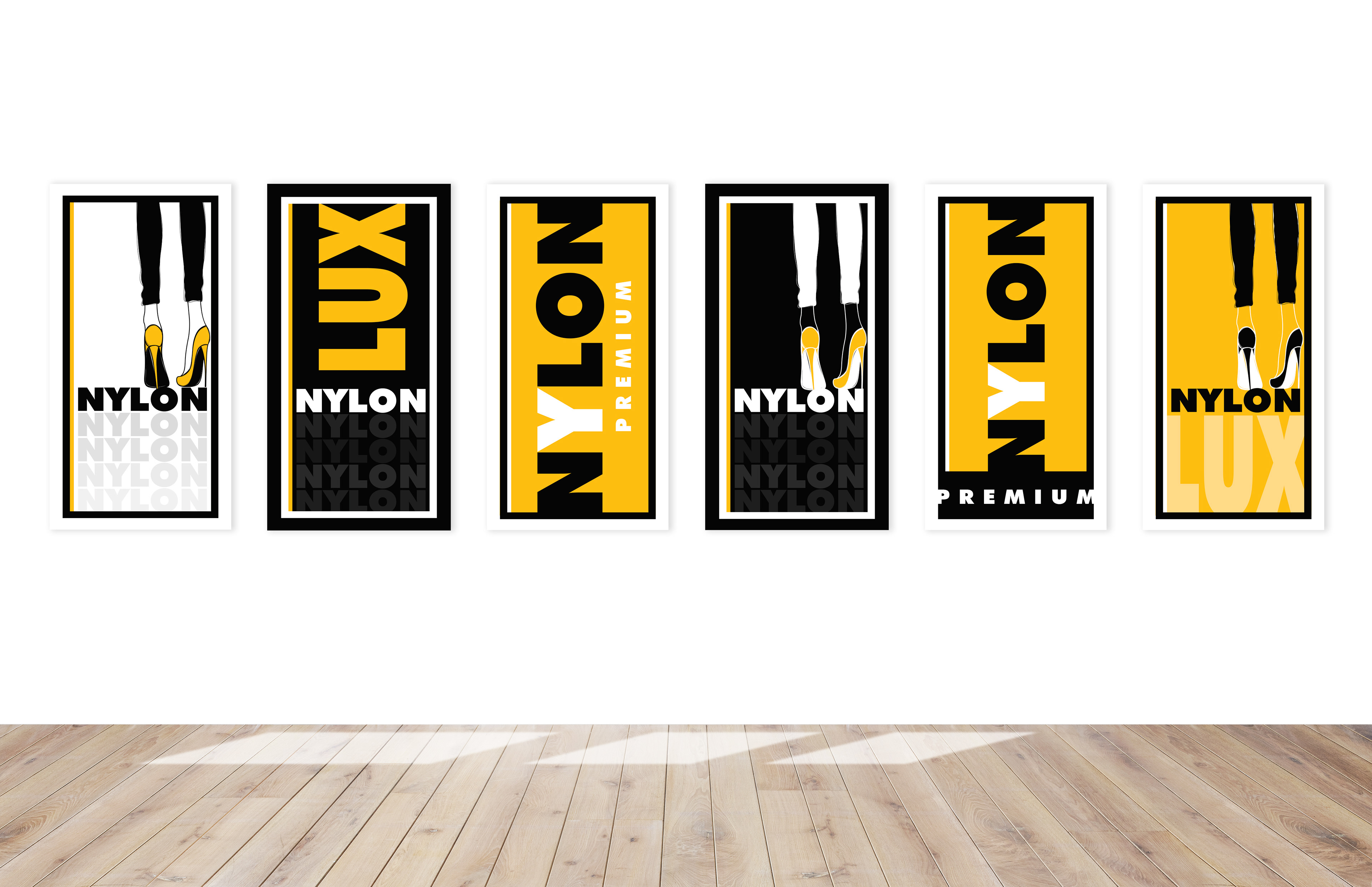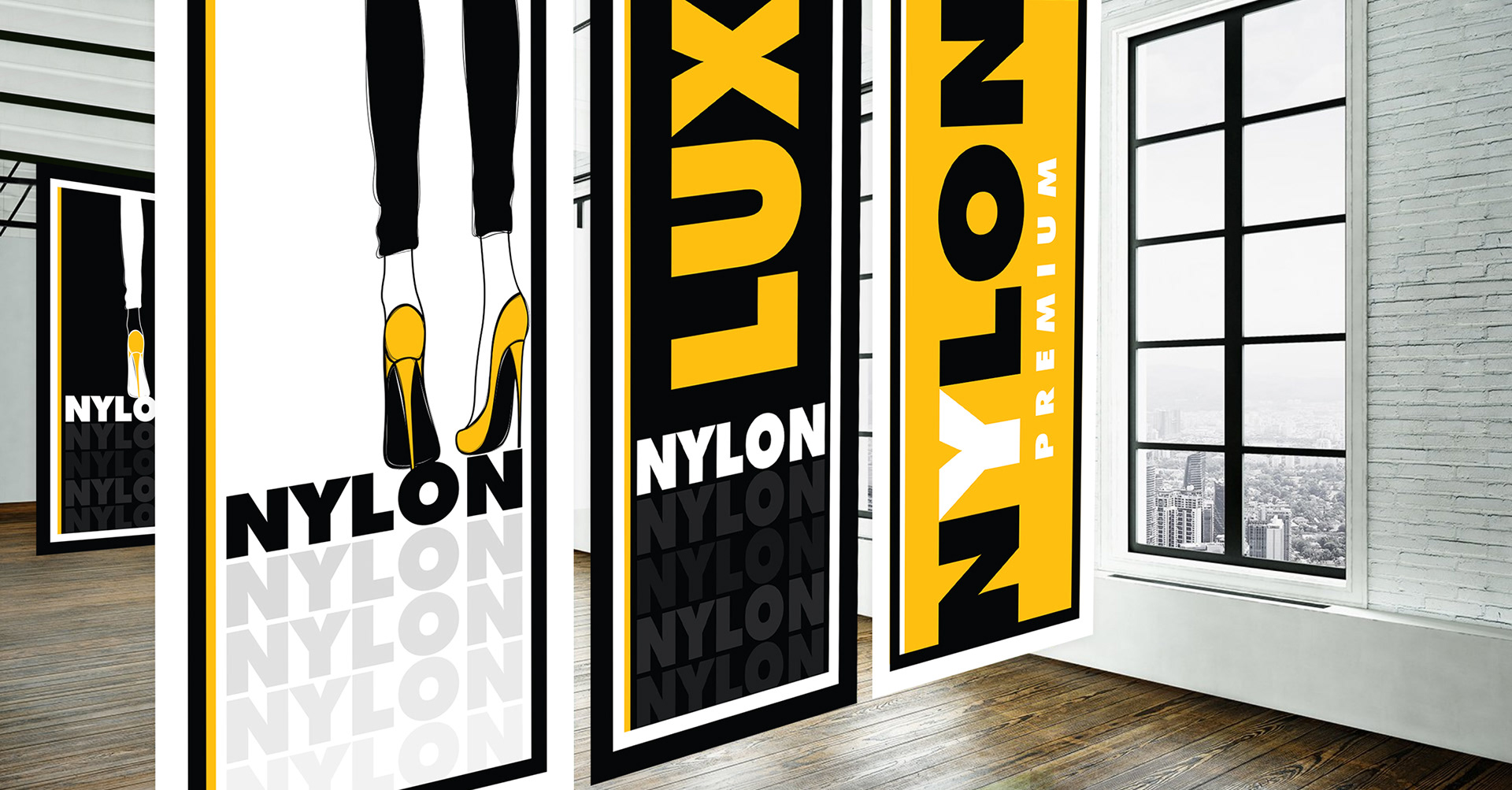 Logo and branding for high-end fashion house: Nylon Lux Premium. Deliverables for this project included: Logo design, clothing/product hang tag, brand style guide, custom graphics and illustrations, 6 indoor banner/signage designs, outdoor signage, 4 custom water bottle label designs, and custom social media graphics.